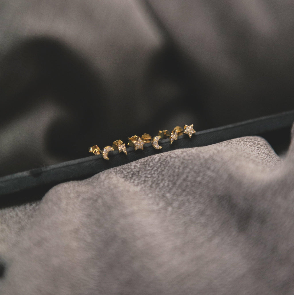 Stormy Lightning, Moon & Star Stud Earrings Set | 18K Gold Plated - Luna Charles | Earrings, gold, Jewellery, lightning, moon, stars, studs, wedding |