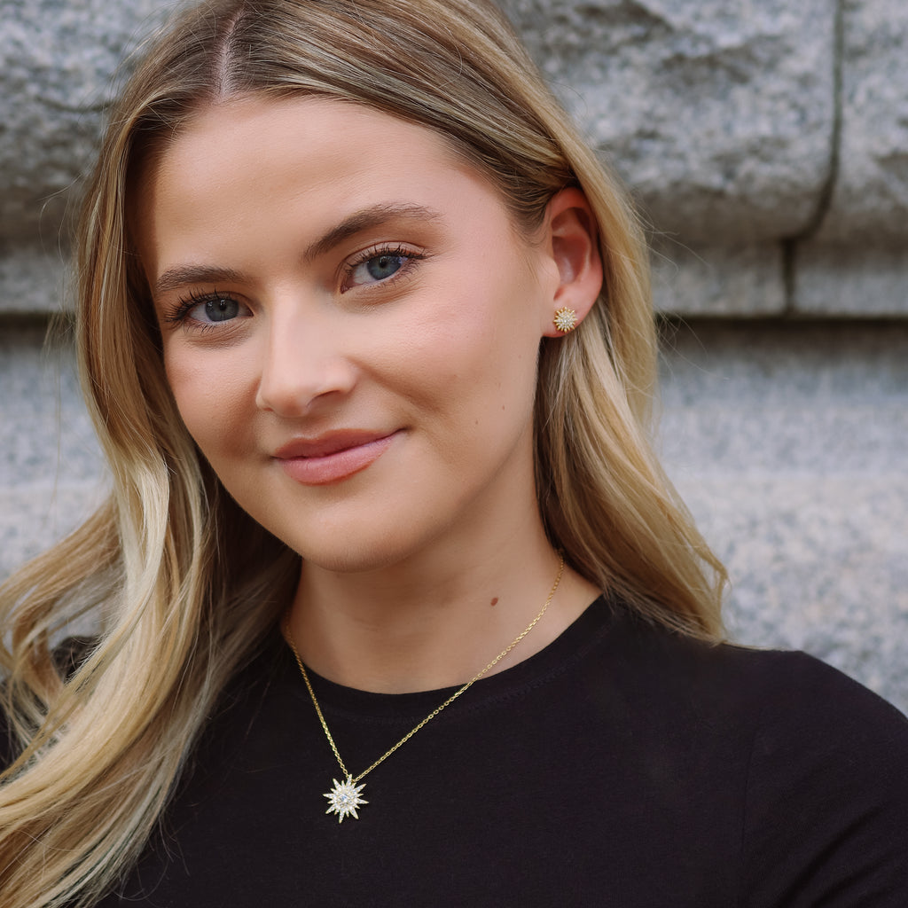 Looking to add some serious bling to your accessory game? Get ready to dazzle with our Rhea Starburst Stud Earrings in 18K Gold Vermeil!
