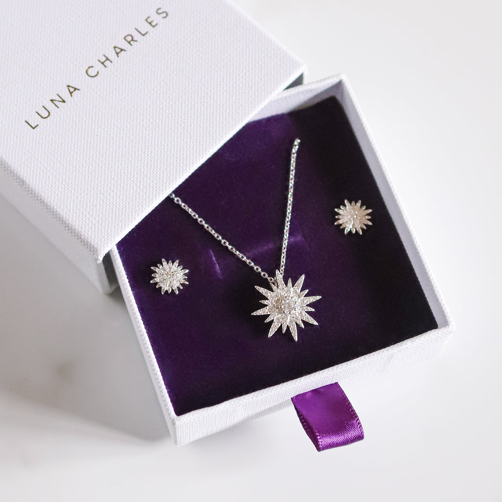 The Starburst Gift Set includes our stunning Estella Starburst Necklace with the matching Rhea Starburst Stud Earrings in Silver